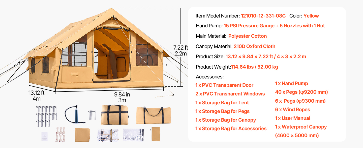 - Spacious 129 SQ.FT. Area: The luxury camping tent offers of space(13.12 x 9.84 x 7.22 ft/4 x 3 x 2.2 m ), comfortably accommodating 5-8 people. It's ideal for family camping, providing room for air mattresses, luggage, and chairs. With a stove jack, it can be used in winter to ensure warmth.