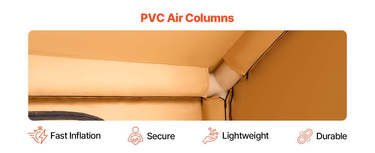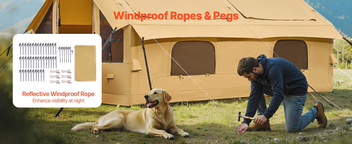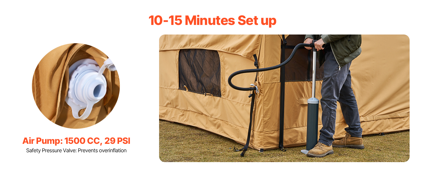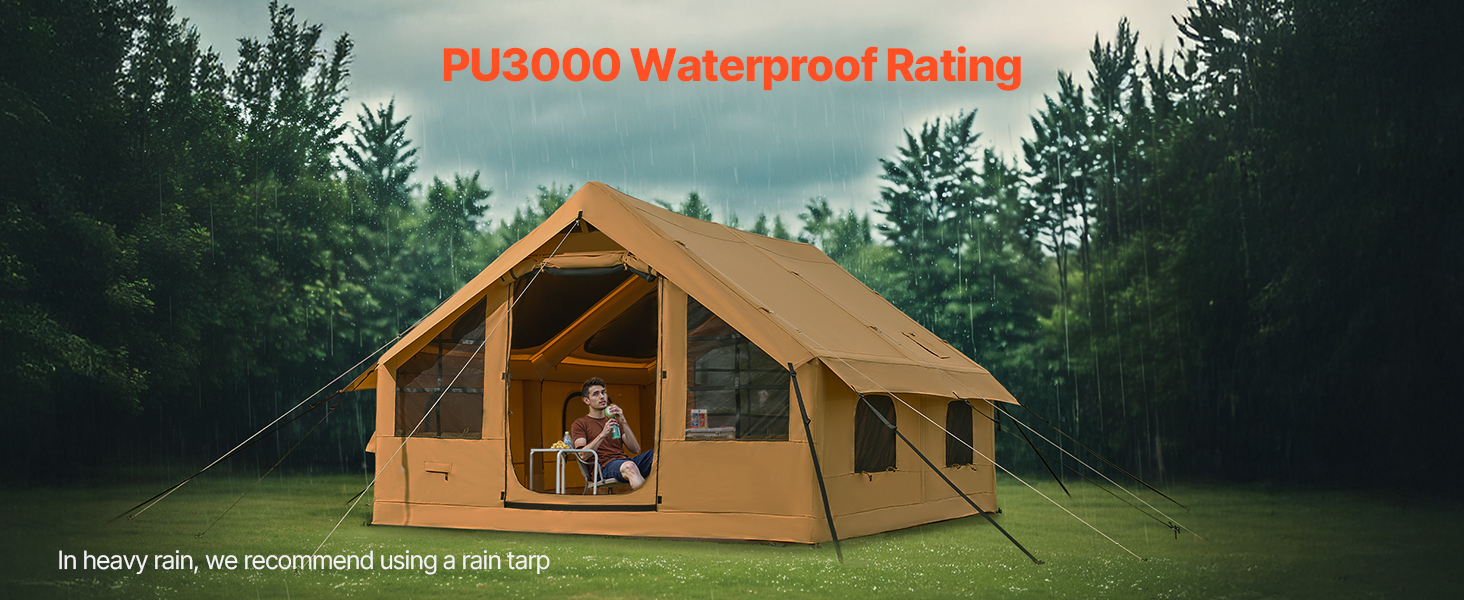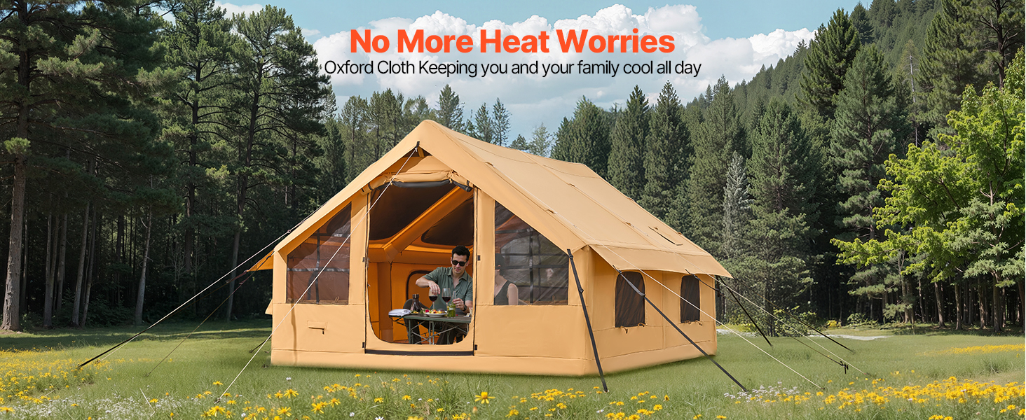 - Durable & Weather-Resistant: Made with high-quality Oxford fabric, the canopy of this blow up air tent blocks harmful sunlight and has a waterproof rating of PU2000, keeping you dry during light rain. The windproof pegs and reflective guy ropes ensure security at night. The polyester cotton fabric offers comfort and breathability, preventing overheating.