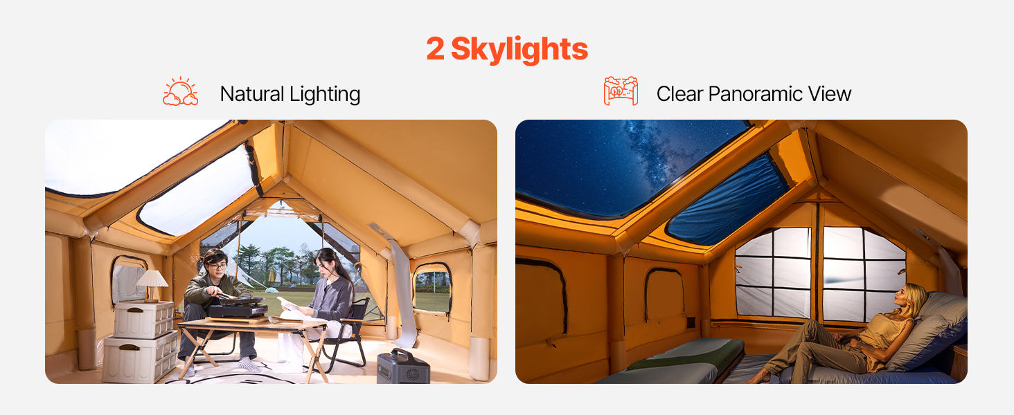 - Ventilation & Breathability: This inflatable camping tent features 2 large skylights, offering panoramic views for stargazing. With 2 doors and 4 side windows, it provides excellent ventilation. Mesh screens block dust, while the zippered doors and windows prevent from animals at night. Enjoy fresh air in your blow up tent!